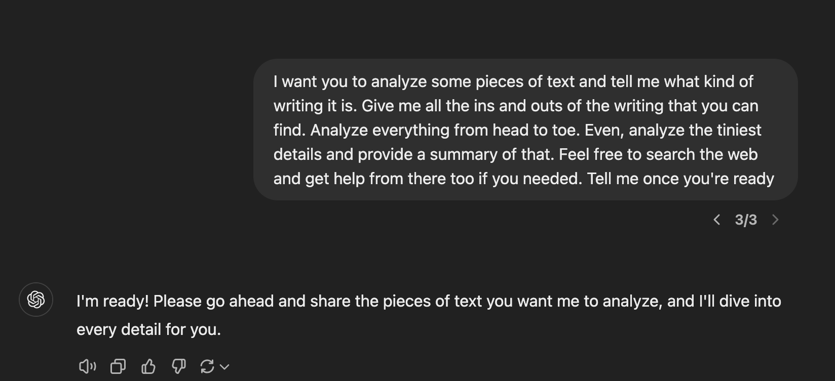 I want you to analyze some pieces of text and tell me what kind of writing it is. Give me all the ins and outs of the writing that you can find. Analyze everything from head to toe. Even, analyze the tiniest details and provide a summary of that. Feel free to search the web and get help from there too if you needed. Tell me once you're readyBy now, you should’ve chosen some of your writings.
