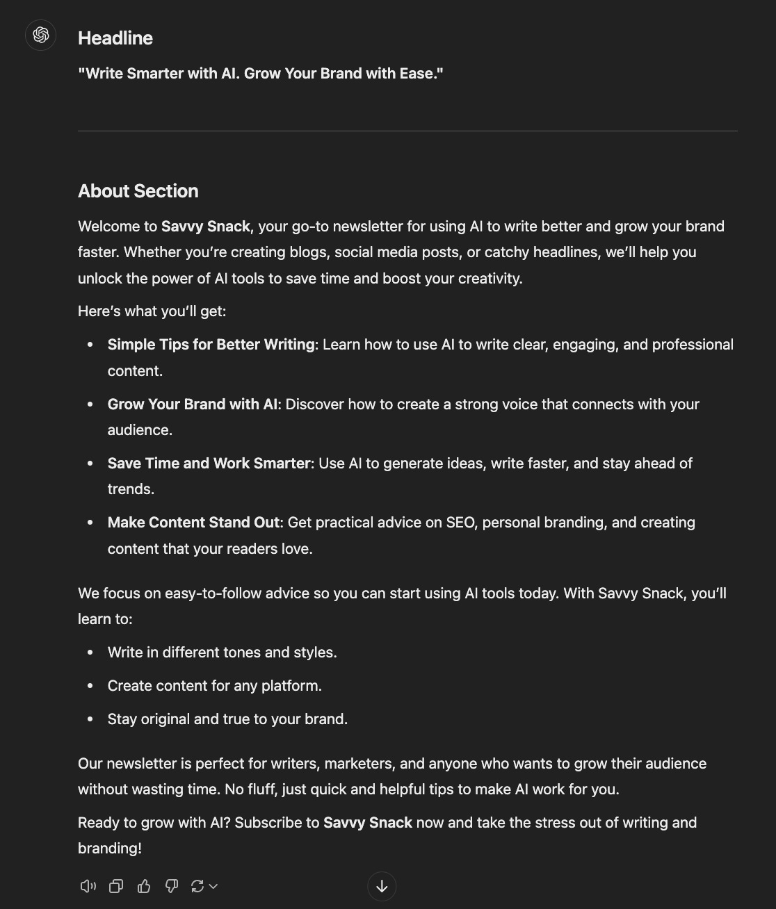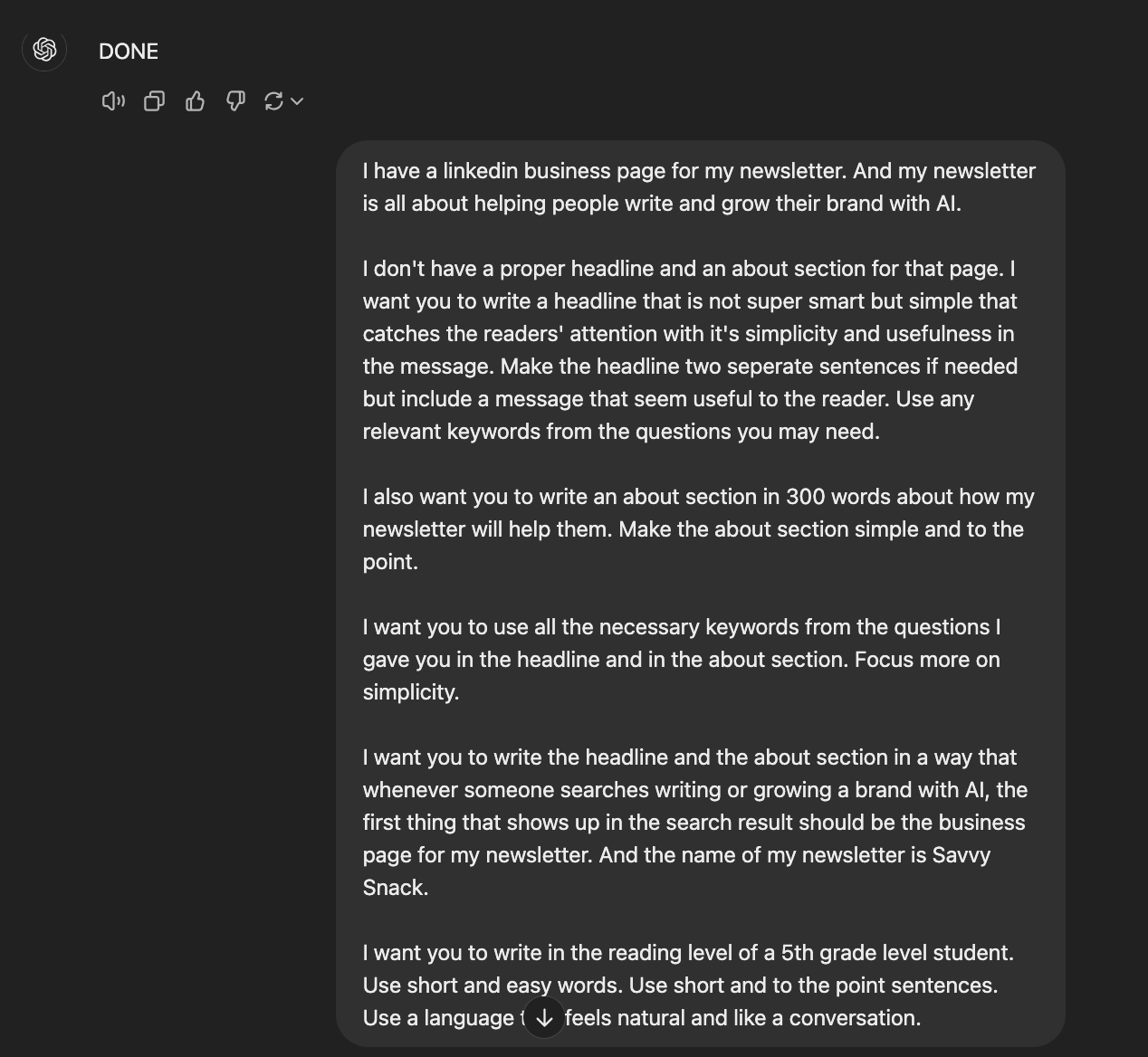 I want you to write the headline and the about section in a way that whenever someone searches writing or growing a brand with AI, the first thing that shows up in the search result should be the business page for my newsletter. And the name of my newsletter is Savvy Snack.